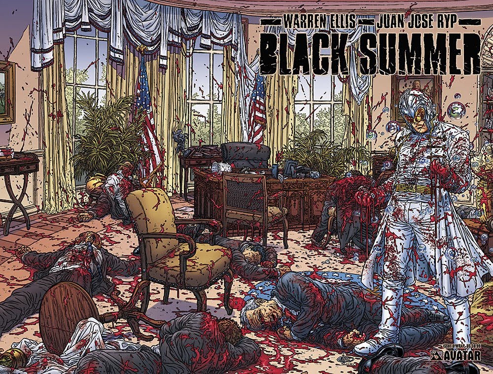 Pero, sobre todo, resulta sorprendente al convertir el 11-S en materia para el humor negro, gore y salvaje. La visión del los rehenes, que no olvidemos tienen el rango de héroes en la realidad, cuyo símbolo en el tebeo es ese niño que ve con ilusión como el superhombre patriota viene al rescate, roza la burla, y todo lo que sucede en el interior del avión es la risión asoluta. Algo inaudito.