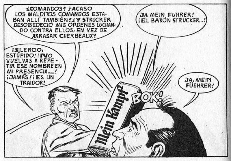 Leyendo tu excelente post me viene a la cabeza una viñeta de un episodio de Sargento Furia en Vértice (aprox. 1975) que lamento no haber conservado. En ella, un soldado alemán dispara gritando cosas absurdas (los nazis de Marvel siempre gritaban mucho, fallaban todos los tiros y eran sumamente idiotas). El soldado vociferaba, para mi sorpresa y diversión BACALLA AMB PESSOLS!! , más o menos alterado con una grafía pseudo-alemana ¿Sería una broma del gran Tunet Vila?