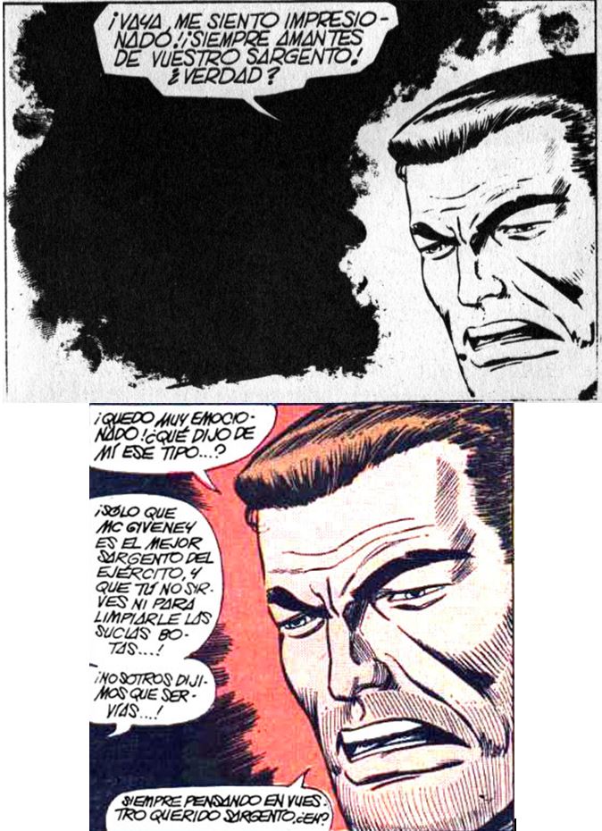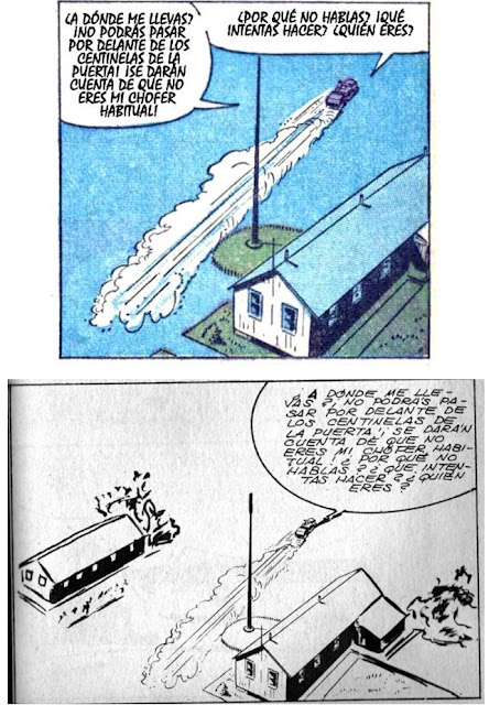 Ahí lo tienen. En color la viñeta original, en blanco y negro la adaptación española con su puño desproporcionado y su carencia de escorzo.